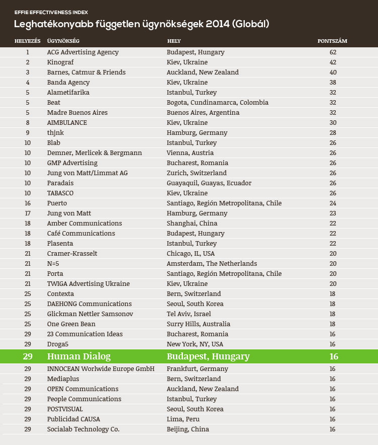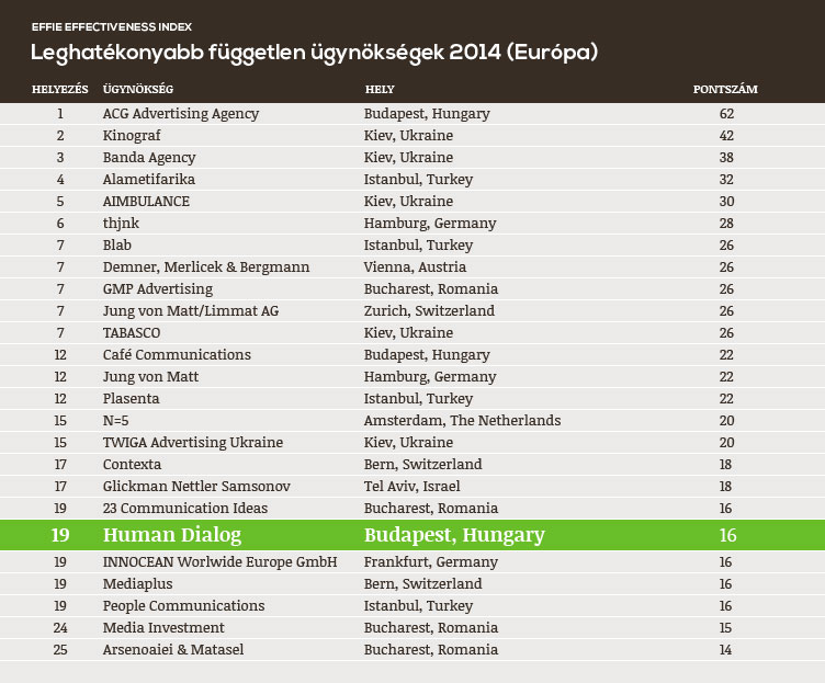 Az Effie globális hatékonyságot mérő indexe alapján 2014-ben a Human Dialog a világ leghatékonyabb független (azaz nem egy nemzetközi hálózat részeként működő) ügynökségeinek listáján a 29. helyet érte el, míg az európai független ügynökségek mezőnyében a 19. a rangsorban. A Human Dialog az Effie Global Effectiveness listáján így a 3. leghatékonyabb magyar független ügynökség.