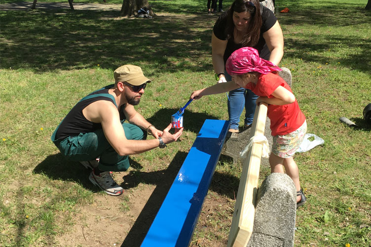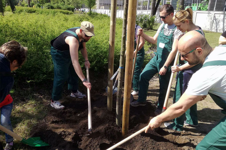 Lelkes csapatunk kapát, lapátot ragadva közösen ültette el a „Human Dialog fát”, amit emléktábla is jelez Emellett betekintést nyertünk a zöldfelület-gondozás rejtelmeibe, részt vettünk néhány fenntartási munkában, vagyis hasznos kertészeti feladatok közben élvezhettük a tavaszi napsugarakat, míg a kreatív vénánk a padfestésben kaphatott szerepet.