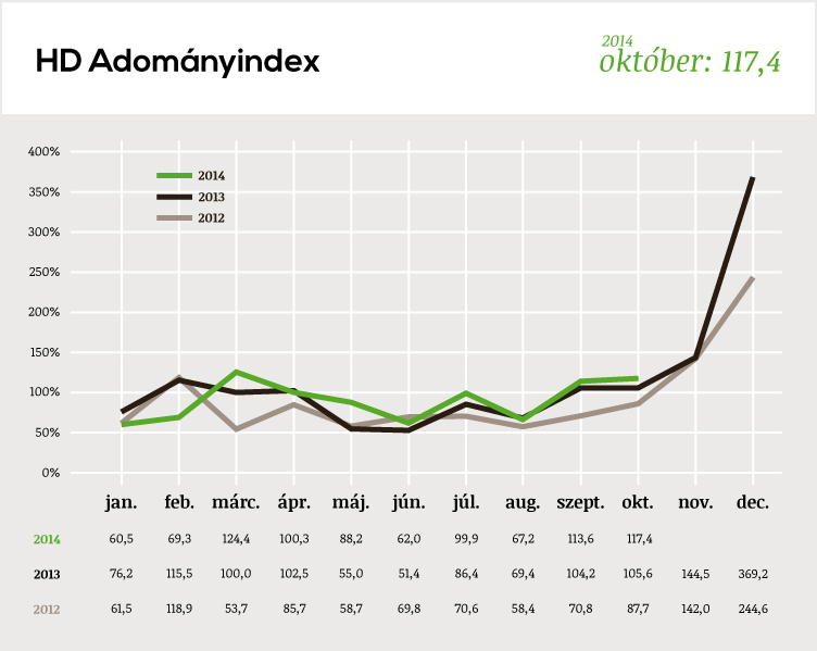 Az októberi számok még erősebb karácsony előtti szezonzáró hajrát jósolnak, a HD Adományindex a szeptemberi 113,4 pont után októberben 117,4-re ugrott, ami minden korábbinál magasabb érték. Joggal bízhatunk benne, kiemelkedően sikeres évet zárnak majd a forrásteremtéssel tudatosan foglalkozó magyar civilszervezetek!