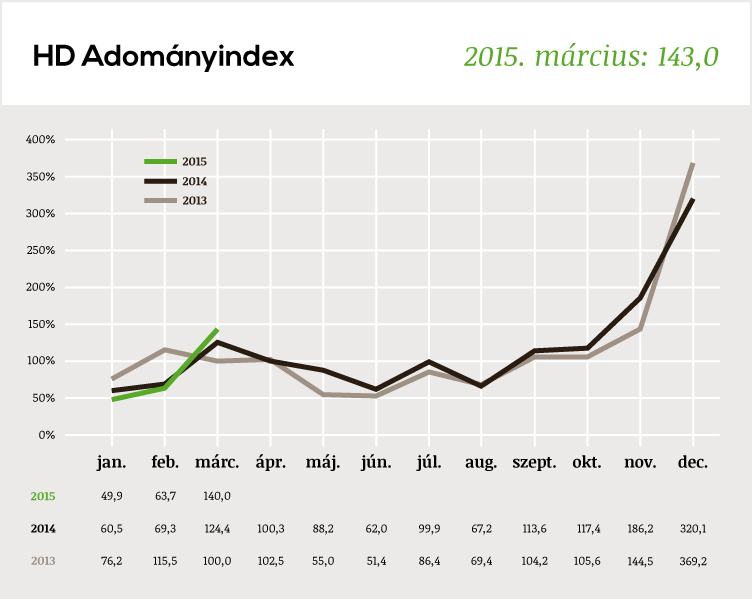 Indexünk márciusi rekord 143 pontja inkább az adományban gazdag év vége tipikus kiugró értékeire hasonlít, ez az eredmény bőségesen kárpótol az év első két hónapjának halványabb számaiért. A HD Adományindex kilengései vélhetően nem a tavaszi időjárás szeszélyeivel állnak összefüggésben, sokkal inkább a megelőző hónapok kampányainak eredménye tolódott kicsit későbbre. Vajon hasonlóan erős lesz-e az április is?