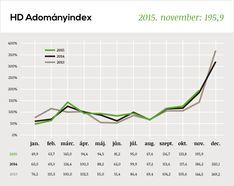 Csekély a tévedés esélye, ha jó eredményt várunk adományozási szempontból a novembertől. Az index számítása óta minden évben a második legerősebb hónap az adott évben a november volt, egyedül a decemberek tudták felülmúlni. A 2015-ös november pedig a csaknem 200 pontos értékével messze kimagaslik a novemberek mezőnyéből is!