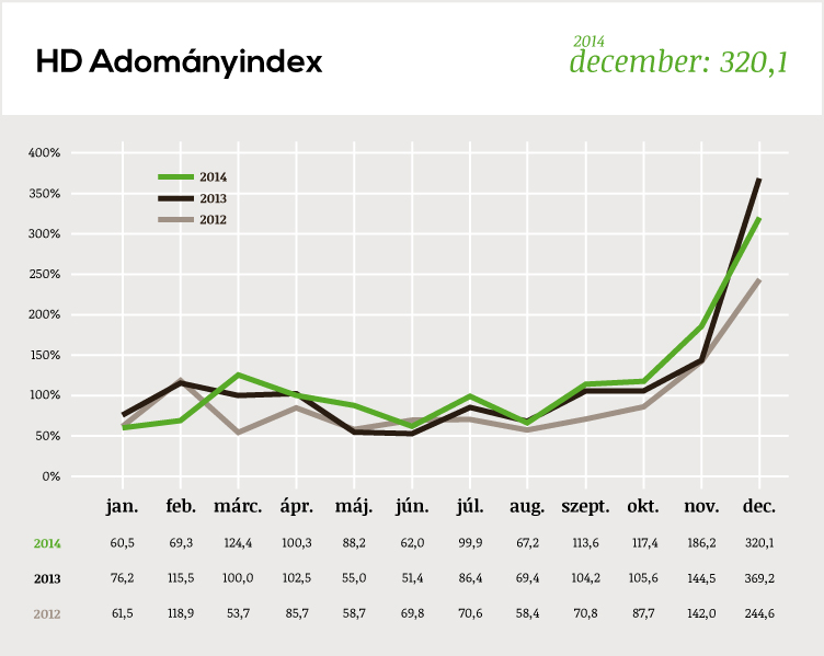 A HD Adományindex őszi hónapokban mért rekordszámai után a decemberi eredmény némileg elmaradt az előző évihez képest. A 320,1 pont persze akkor is szép eredmény, ha az 49 ponttal kevesebb a 2013-as adatnál. A remélt decemberi rekord elmaradása mögött valójában az ingadozások kiegyenlítődése áll, hiszen a 2014. év egészében az index számításakor figyelembe vett civilek összességében több adományt kaptak, csak a korábbinál kisebb mértékben összpontosult a támogatás decemberre.