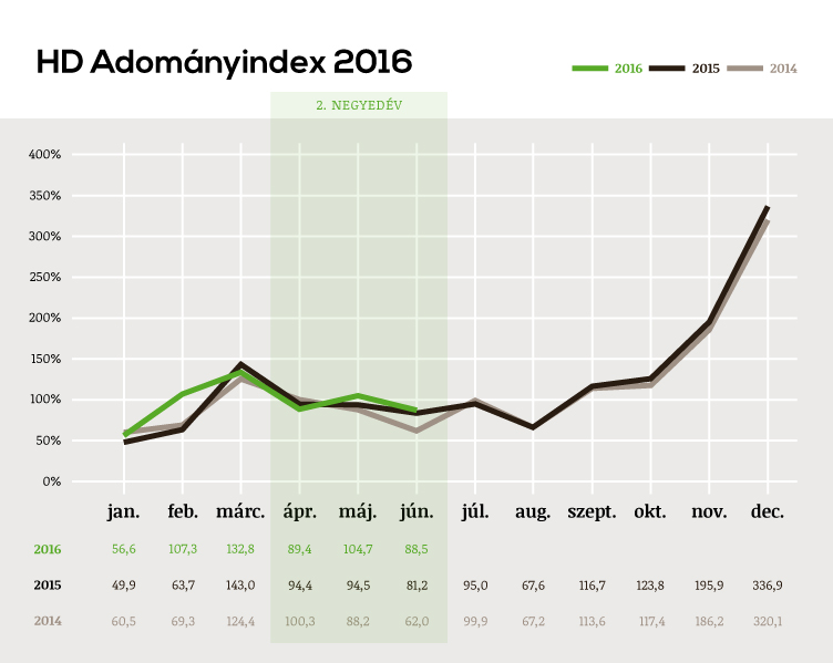 A második negyedévben is minden történelmi értéket felülmúlóan erős adományozási kedvet mutat a HD Adományindex. Mindebben ráadásul egy rekordgyenge április is benne van, ám ezt bőven kompenzálják a szokatlanul erős májusi és júniusi számok. Összességében, az egész első félévet tekintve még soha nem állt ilyen magasan az index értéke. Vajon hogyan alakul a nyári uborkaszezon?