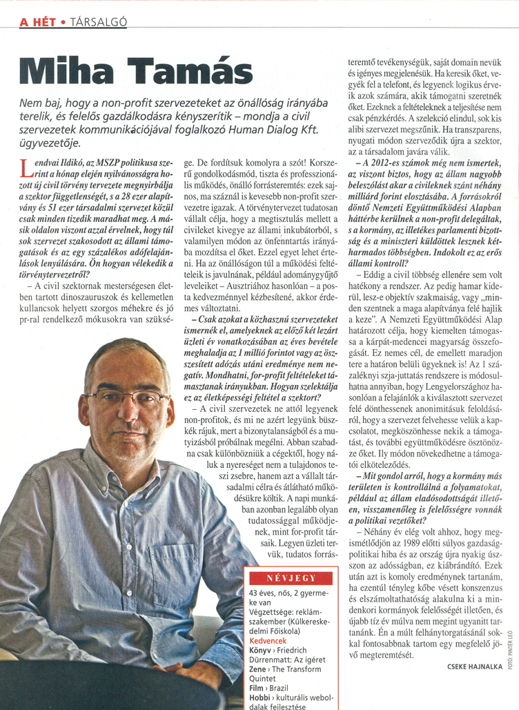 Nem baj, hogy a non-profit szervezeteket az önállóság irányába terelik, és felelős gazdálkodásra kényszerítik – mondja a civil szervezetek kommunikációjával foglalkozó Human Dialog Kft. ügyvezetője.