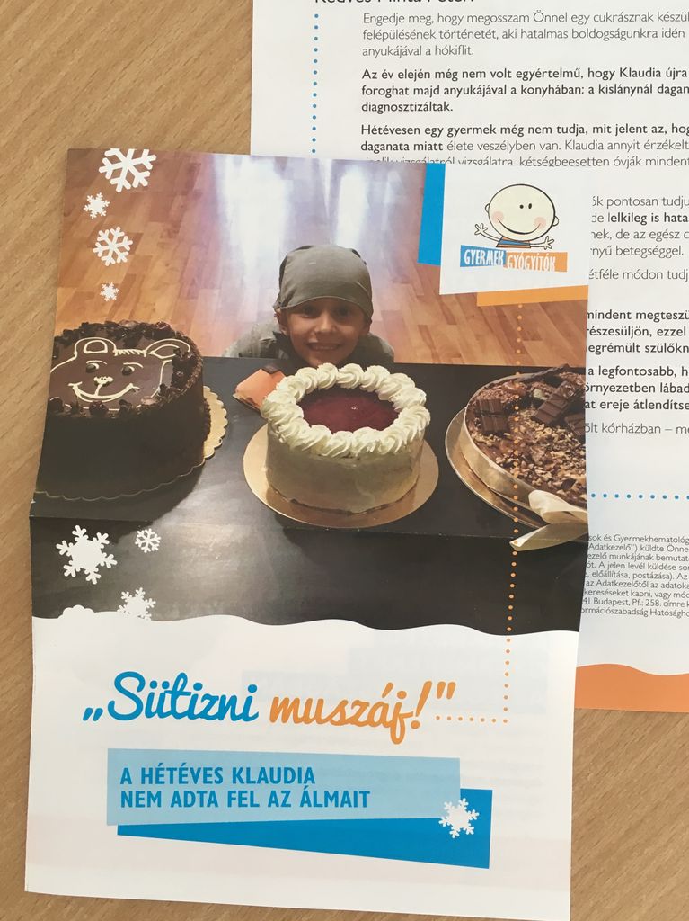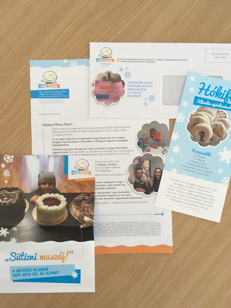 Ajándékként Klaudia egyik kedvenc süteményének receptjét is a borítékba tettük – karácsony közeledtével ez a hókifli volt –, és a statisztikák azt mutatták, a kampány elérte célját. Kimagasló válaszadási arányt ért el, a megszólítottak közel 23%-a adományozott. Közel háromszoros volt a kampány megtérülési aránya, amivel szintén elégedettek lehettünk.