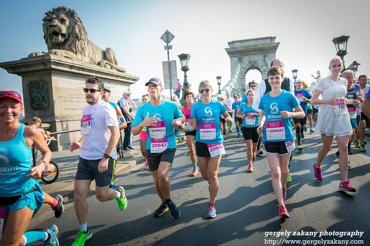Márk és kísérője a Lánchídon futnak át egy futóversenyen. Olyan önkéntes tud neki segíteni, aki elvégezte a SUHANJ! képzését, és hasonló tempóban fut, mint Márk. Fotó: Zákány Gergely
