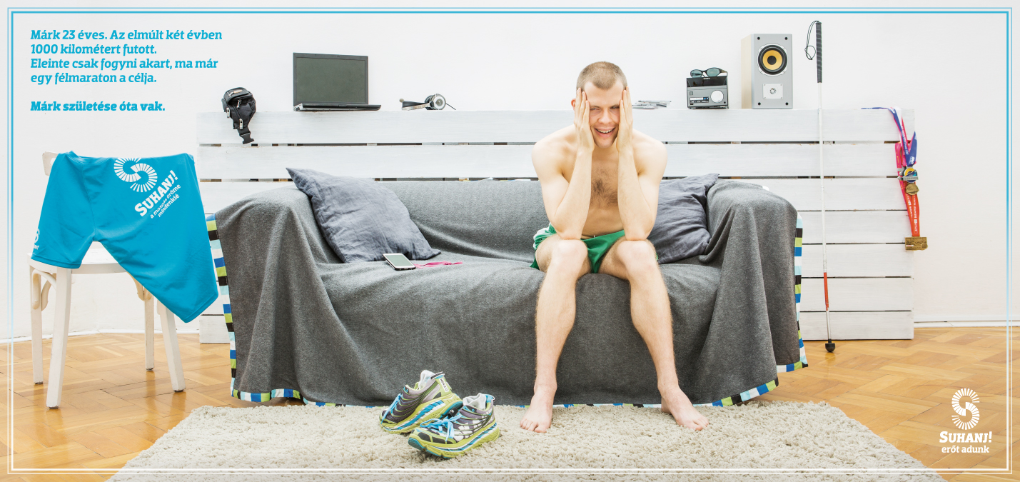 Egy boldog és fáradt, izmos, fiatal férfit láthatunk a képen. Sokat futott, nemcsak ma, de az elmúlt két évben is. 1000 kilométer van mögötte. És mínusz húsz kiló. Plakátunkkal azt az erőt és örömet szeretnénk megmutatni, amit Márk sugároz. Szeretnénk tisztán a nézők elé tárni, milyen boldogságot ad a mozgás, amit fogyatékossággal élő sportolók élhetnek át a SUHANJ! Alapítványnál.