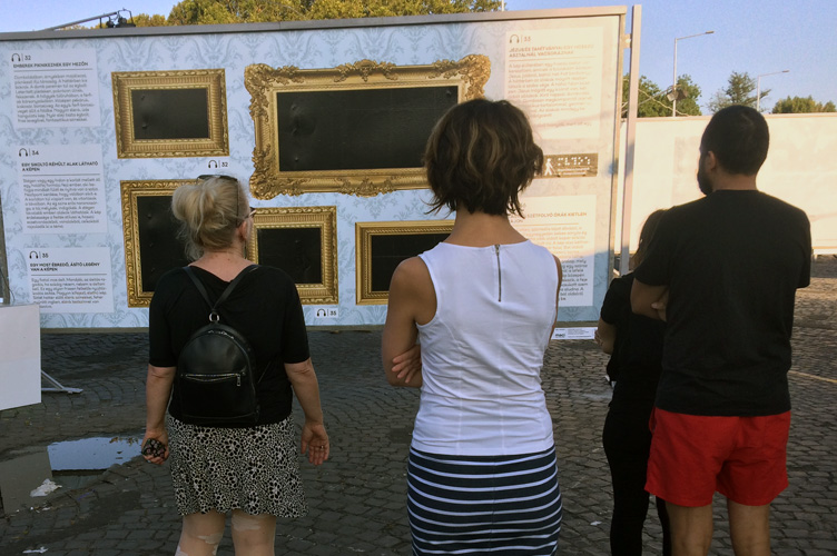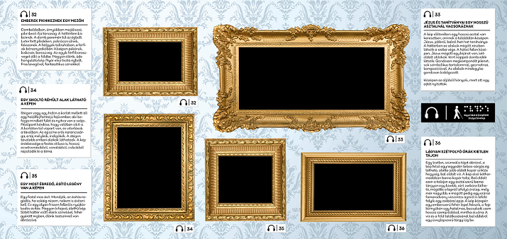 Az idei pályaművünk címe: Egy vak kiállítás képei. A múzeumi falat idéző háttéren, díszes keretekben éjfekete a vászon. Csak sejthetjük, hogy értékes műalkotások vannak alatta. A múzeumok audio guide-jára emlékeztető módon jeleztük, hogy mely festményhez mely leírás tartozik. Ezeket a leírásokat elolvasva megelevenedhet az ember előtt egy-egy világhírű festmény. A leírásokat Erhardt Péter, az MVGYOSZ munkatársa készítette, aki látássérült édesanyja mellett már gyermekként nagy rutint szerzett a látható világ elmesélésében, azóta pedig professzionális narrátorrá vált. A plakát grafikáját pedig Csobod Luca készítette.