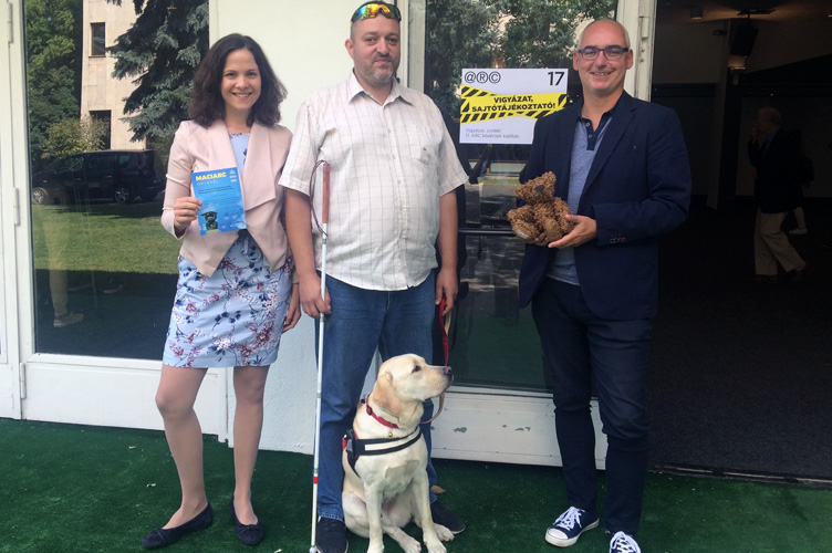 A díjátadó után: Mécs Anna, a Human Dialog kreatív vezetője, Angyal Gábor, az MVGYOSZ szakmai vezetője, Miha Tamás, a Human Dialog ügyvezetője és Radar, Gábor vakvezető kutyája.