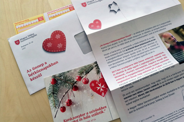 A karácsonyi adománygyűjtő akciót a Human Dialog csapatával együtt álmodták meg: a küldemény egy megszemélyesített, kétoldalas levél és egy karácsonyi képeslap mellett borítékból, egy ajándékkuponból és egy csekkből állt.