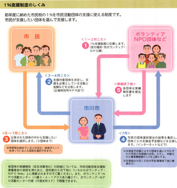 A magyar rendszer adaptált változatát 2004-es rendeletben írták le, és 2005-től lehetett felajánlani az adó 1%-ot. A helyi adófizetők mellett a helyi adóval nem rendelkező, de az ichikawai non-profit szervezetekben önkéntesként aktívan tevékenykedő lakosok is megjelölhették azt a legfeljebb három szervezetet, melyet támogatnának. Ennek oka az volt, hogy sok esetben a hét öt napját a japán fővárosban töltő dolgozók sokkal kevésbé láttak rá a helyi közösségek működésére, míg a helyi szervezetekben leginkább az önálló keresettel nem bíró anyukák önkénteskedtek.